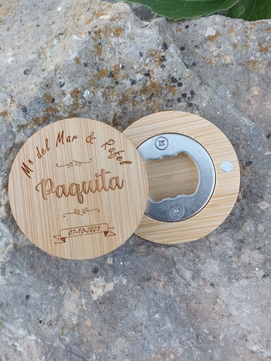 Abre chapas de madera, impresas y personalizadas, para regalar a tus invitados.