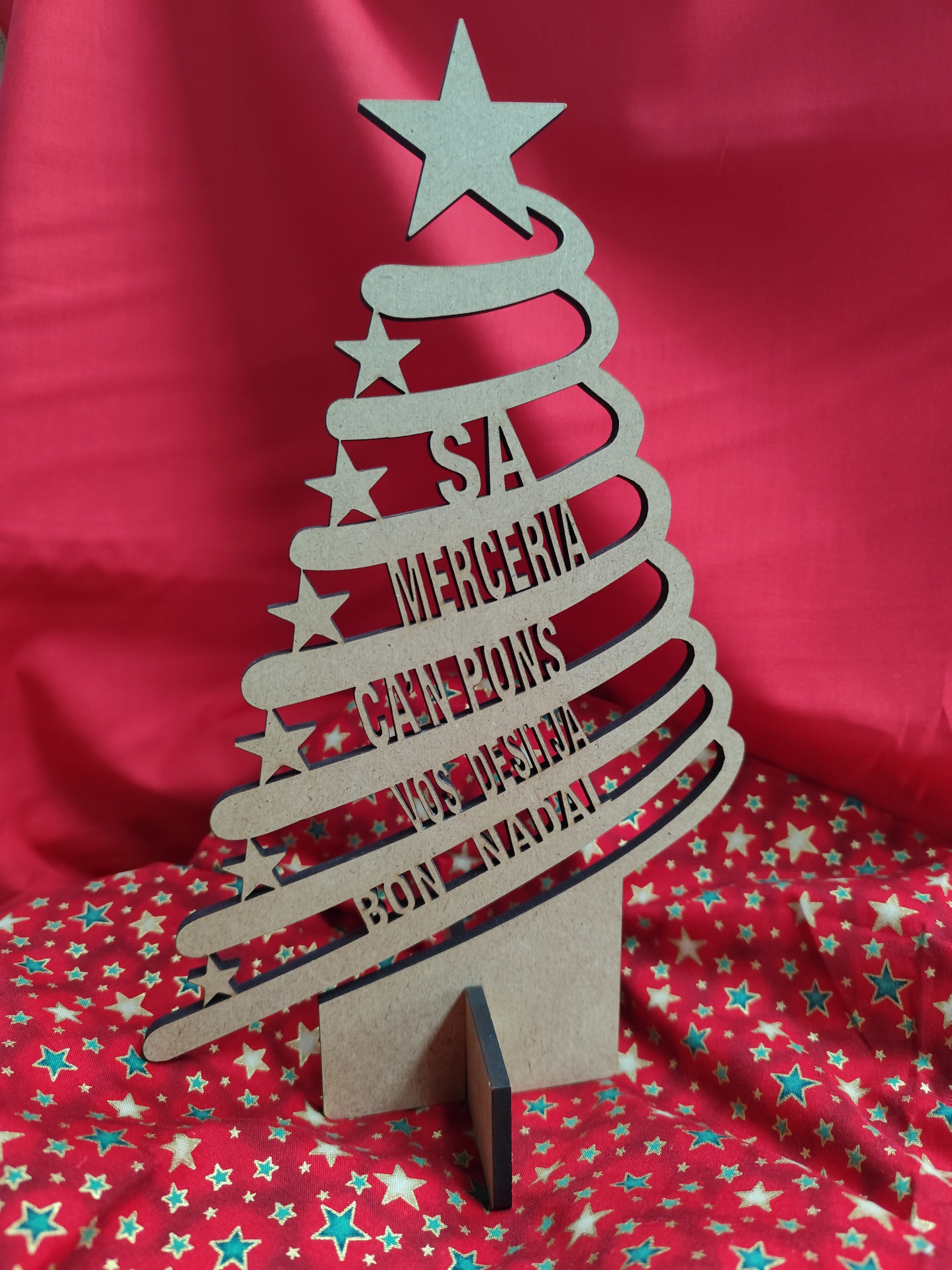 Árbol de Navidad personalizado en madera MDF cortado a láser, decorado con el nombre de tu empresa o con los nombres de tus seres queridos. Ideal para regalos familiares o como decoración navideña.