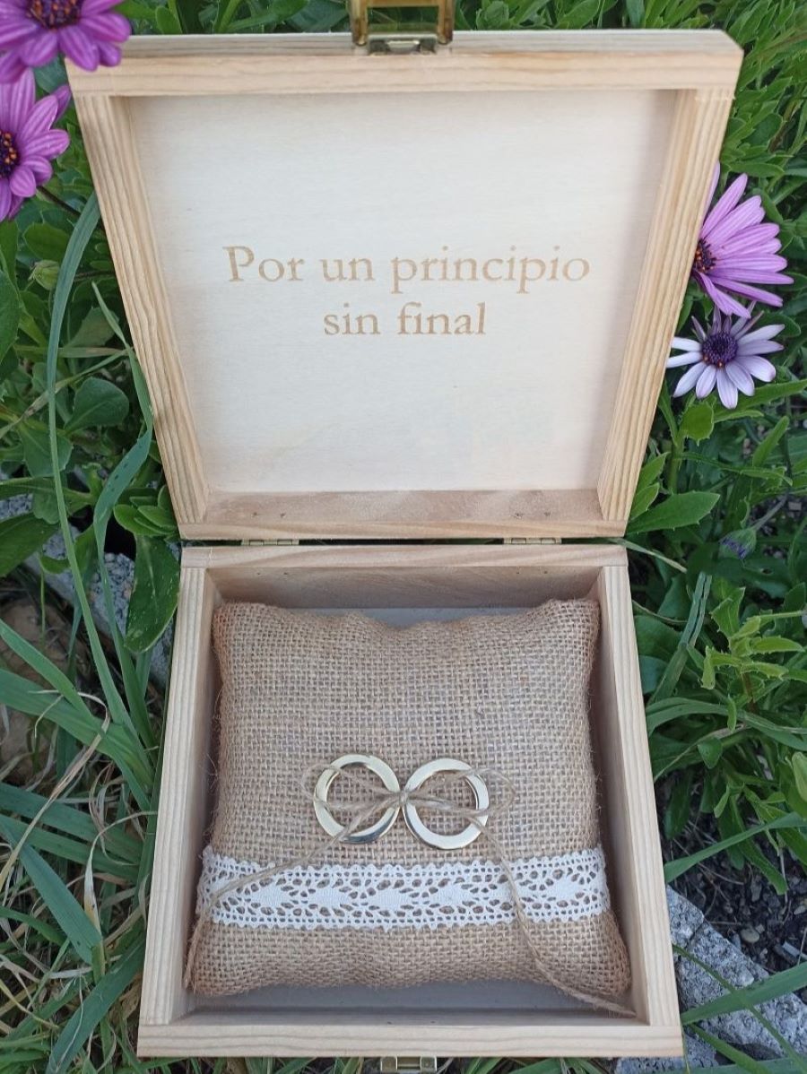 Cajita de madera de faig, porta anillos con un cojín de tela de yute. Decorado y personalizado. A elegir entre dos diseños.