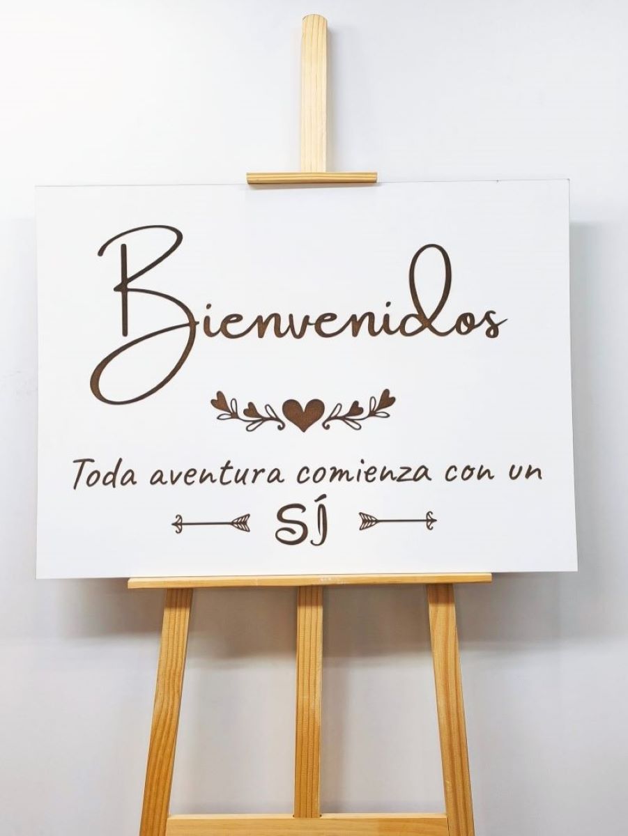 Cartel de madera DM blanco, grabado a láser. Para dar la bienvenida de una manera personalizada.