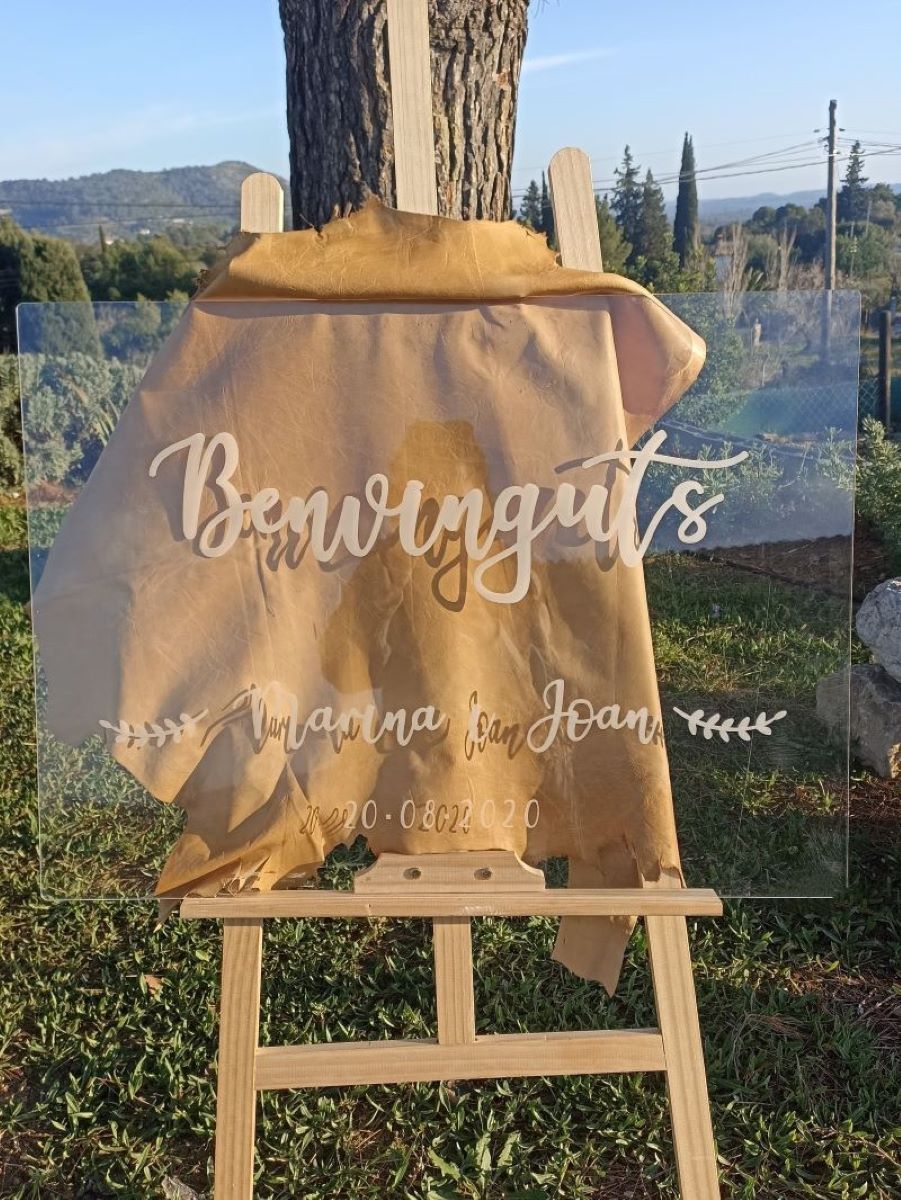 Cartel de metacrilato, grabado a láser. Para dar la bienvenida de una manera personalizada.