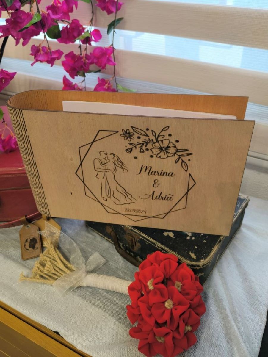 Libro de firmas de madera tablero grabado a láser con doble anilla.