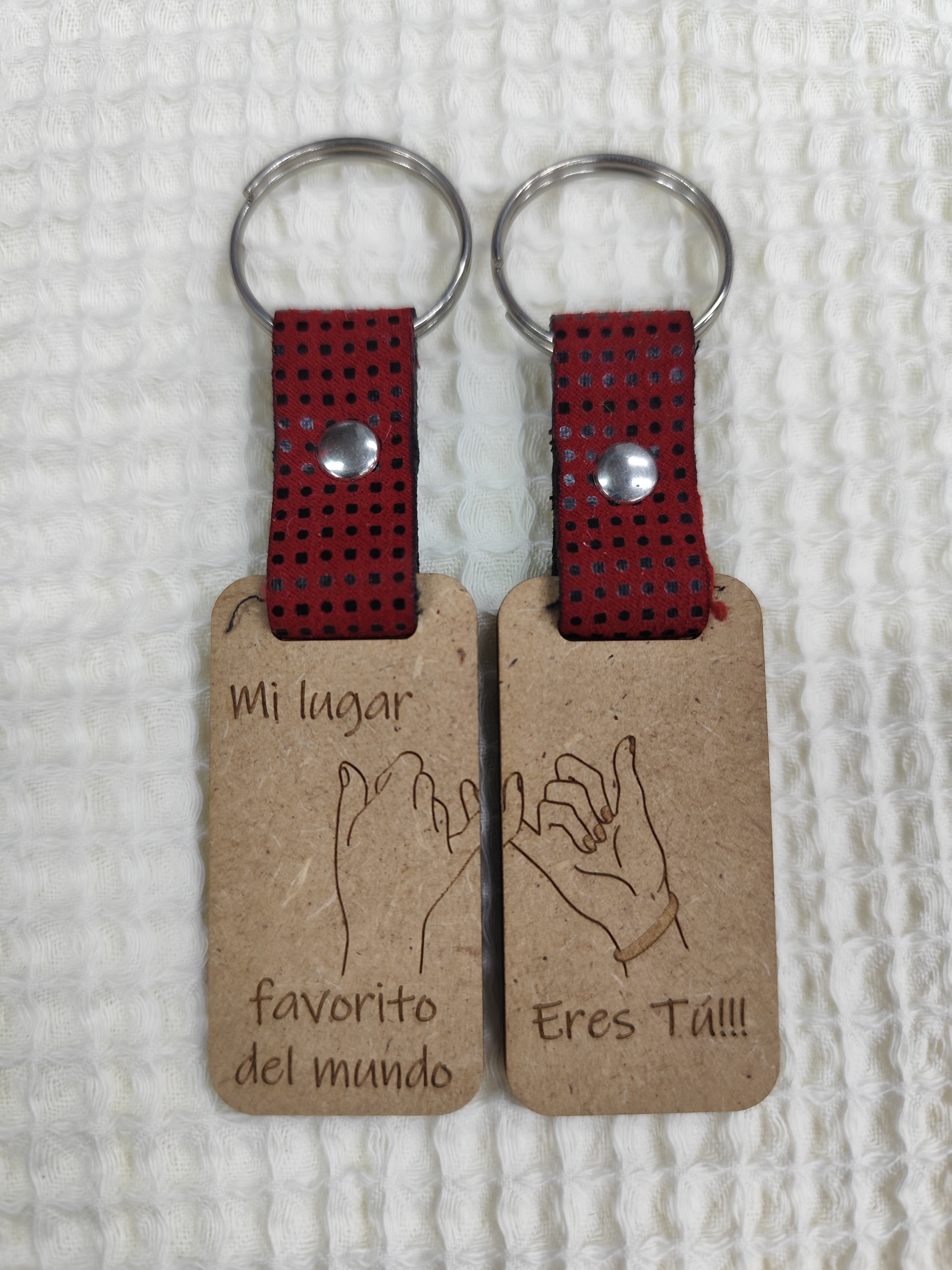 Pareja de llaveros de madera, material de la tira sintético con su anilla y remache de color níquel.