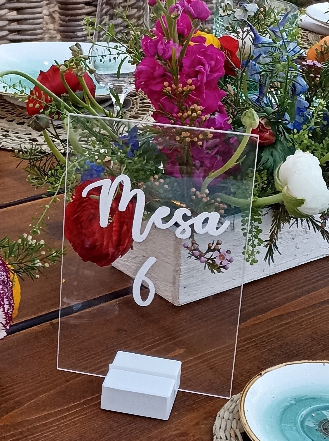 Indicador numérico de metacrilato grabado a láser, para identificar las mesas. Cantidad mínima 10 und. No incluye peana.