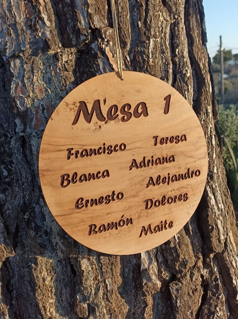 Organizador de mesas en madera de olivera, grabado a láser, para ubicar a los invitados.