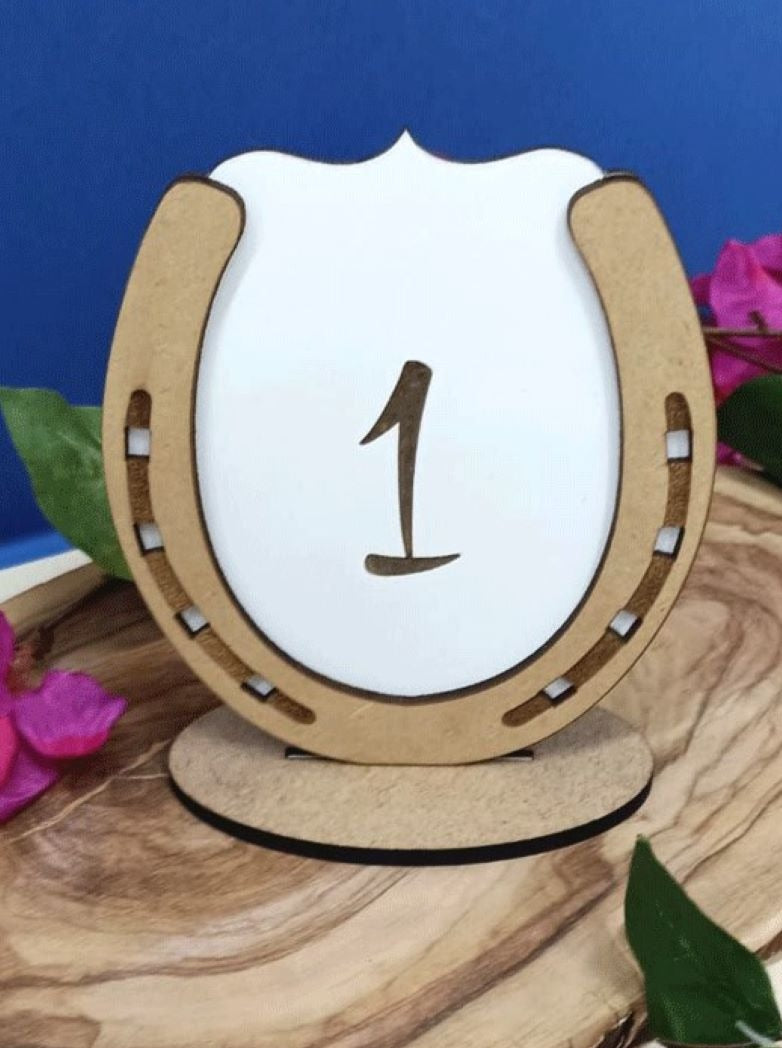 Indicador numérico de madera DM blanca y marrón con base, grabado a láser, para identificar las mesas.