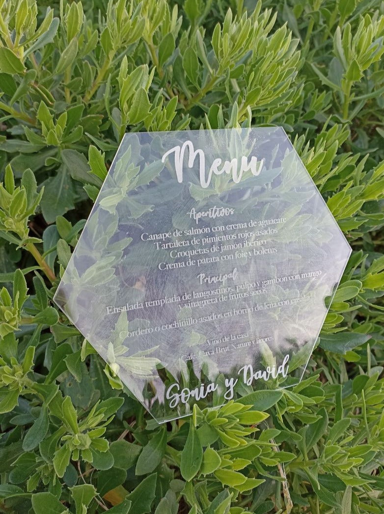 Minuta de metacrilato grabado a láser, para detallar el menú. Pedido mínimo 10 und.