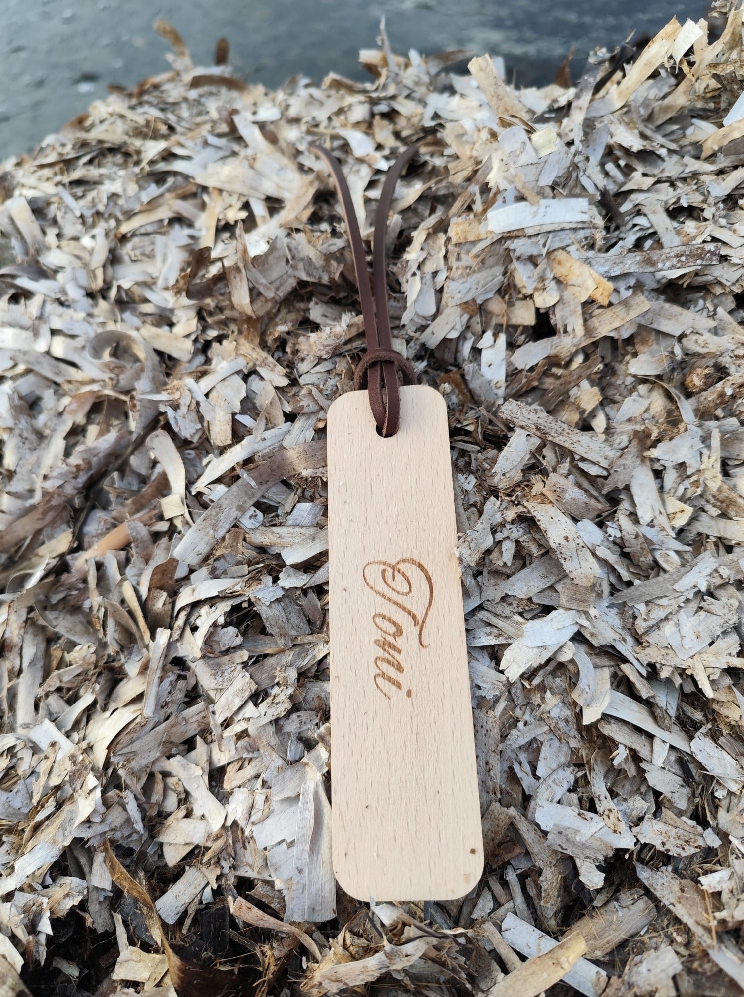 Punto de libro en madera faig con tira de piel color marrón.