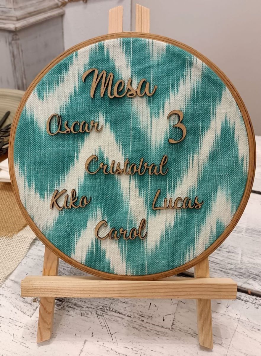 Medidas 20 cm de diámetro. Incluye 10 nombres de invitados por tambor, el número y "Mesa". No incluye caballete.