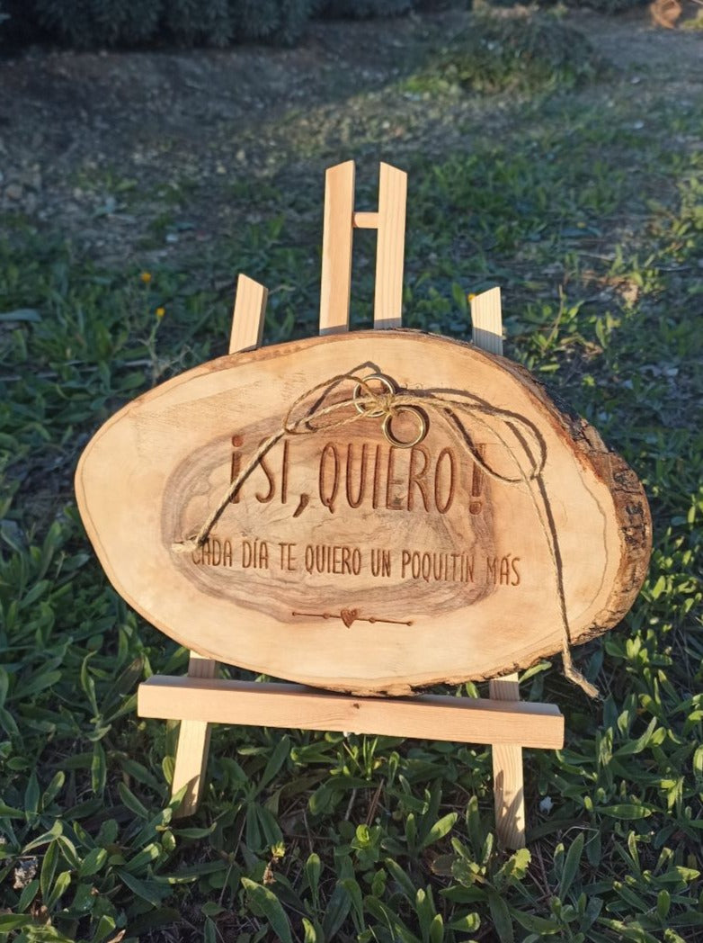Porta anillos en tabla de madera de olivera lacada y personalizada con vuestros nombres o una frase a elección.