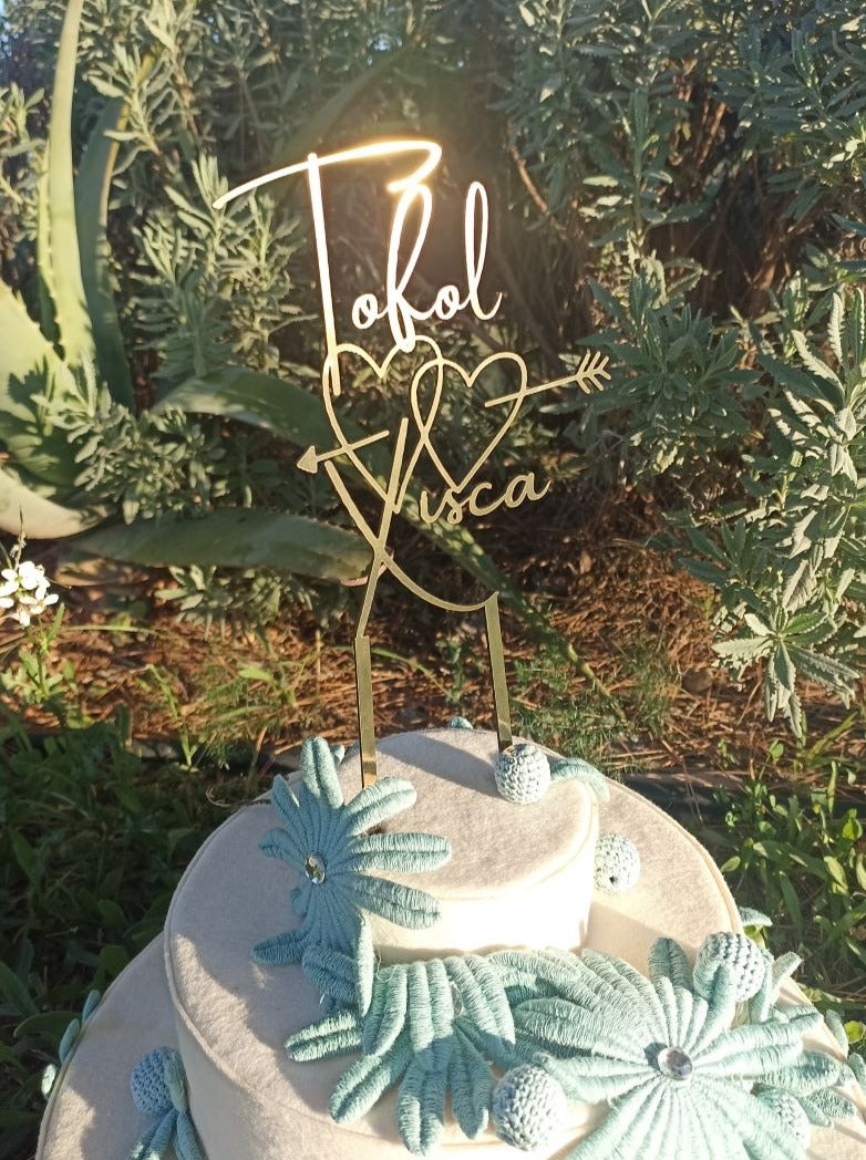 Topper de tarta de material sintético metálico, personalizado a láser con vuestros nombres. Dos colores disponibles Medidas...